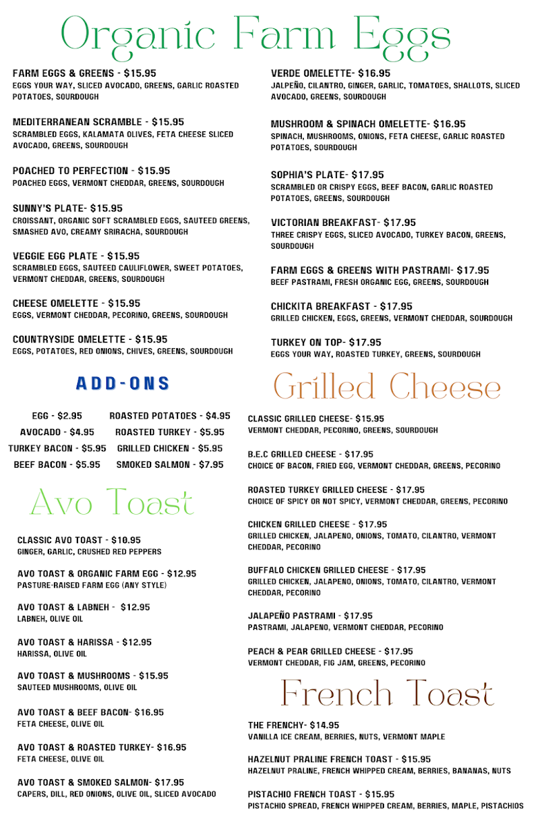 Welcome to Victorian Cafe, a charming haven located at 1029 Cortelyou Rd, Brooklyn. This delightful cafe boasts an impressive menu filled with mouthwatering options that cater to every palate. Start your meal with their signature Grilled Cheese variations, including the classic Vermont cheddar or the robust B.E.C, perfect for those craving a savory treat.